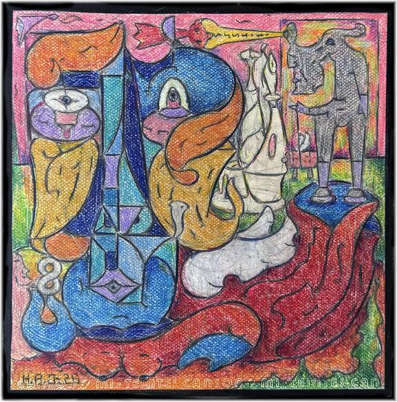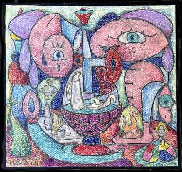New untitled Personal Fantasy Piece from Small "Sometimes I like to do Goofy Figuratives With Still Life snd Stuff In Them" Series 12"x12"x .05" 2024-Till .Under new work 2018- Till. Graphite, ink, Prismacolor and Neo-Color Crayons on Pastel Paper and mounted on board sealed sealed with Acrylic gel
