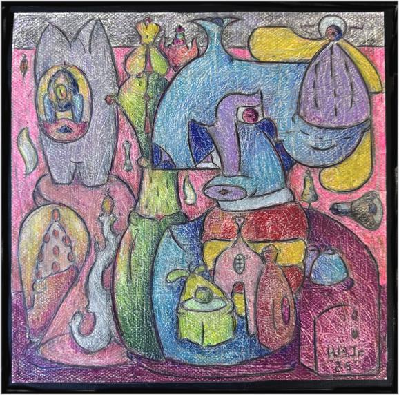 New untitled Personal Fantasy Piece from Small Sometimes I like to do Goofy Figuratives With Still Life In Them Series 12"x12"x .05" 2024-Till .Under new work 2018- Till. Graphite and mixed media color on Paper and mounted on board sealed sealed with acrylic gel