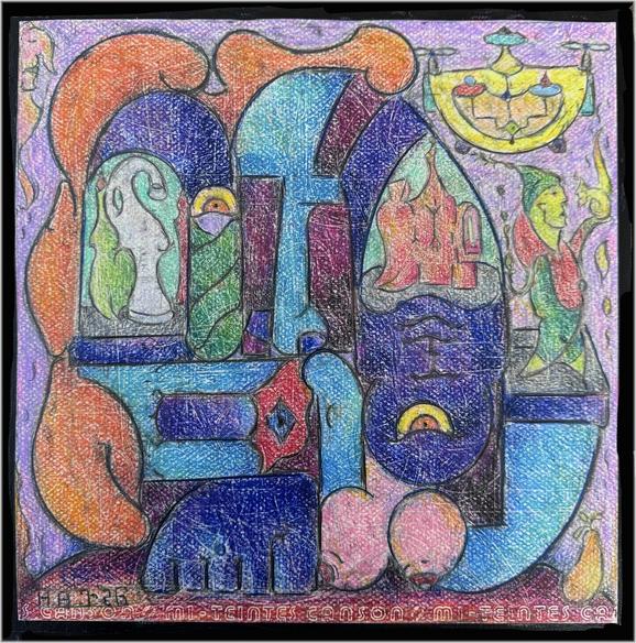 New untitled Personal Fantasy Piece from Small "Sometimes I like to do Goofy Figuratives With Still Life In Them" Series 12"x12"x .05" 2024-Till .Under new work 2018- Till. Graphite, ink, Prismacolor and Neo-Color Crayons on Pastel Paper and mounted on board sealed sealed with Acrylic gel